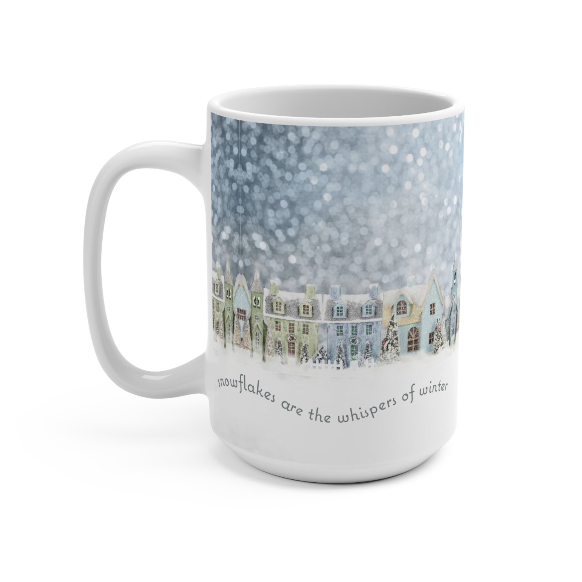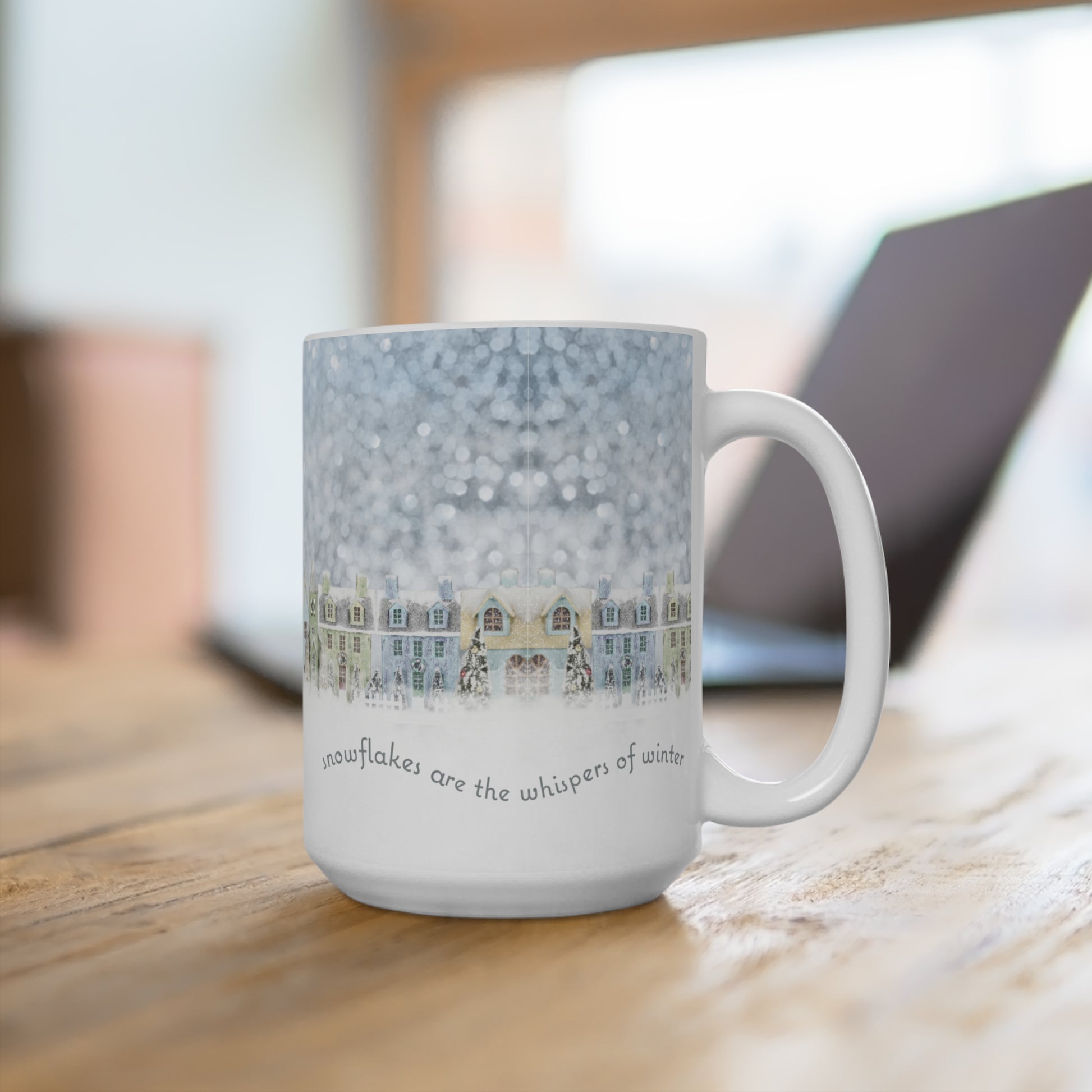 Embrace the magic of winter with this charming 15 oz mug featuring a serene snowy town scene and the heartfelt saying, "Snowflakes are the whispers of winter." Perfect for sipping hot cocoa, coffee, or tea, this mug adds a touch of cozy elegance to your holiday mornings.