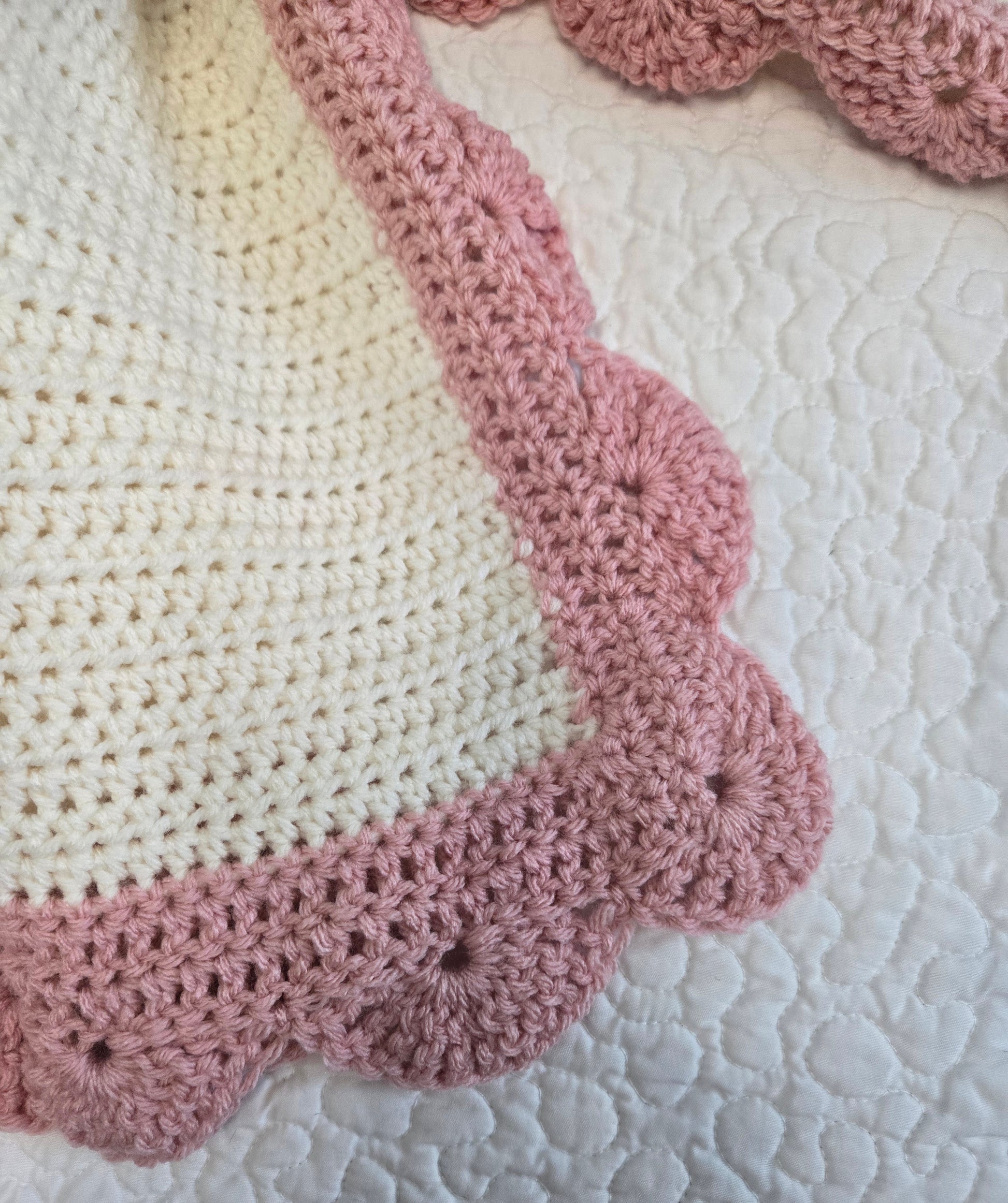 Bring timeless charm to your little one’s nursery with our handmade cream crochet baby blanket, finished with a delicate rose-colored scalloped edge. Soft, cozy, and crafted with care, this blanket is designed to be both beautiful and practical.