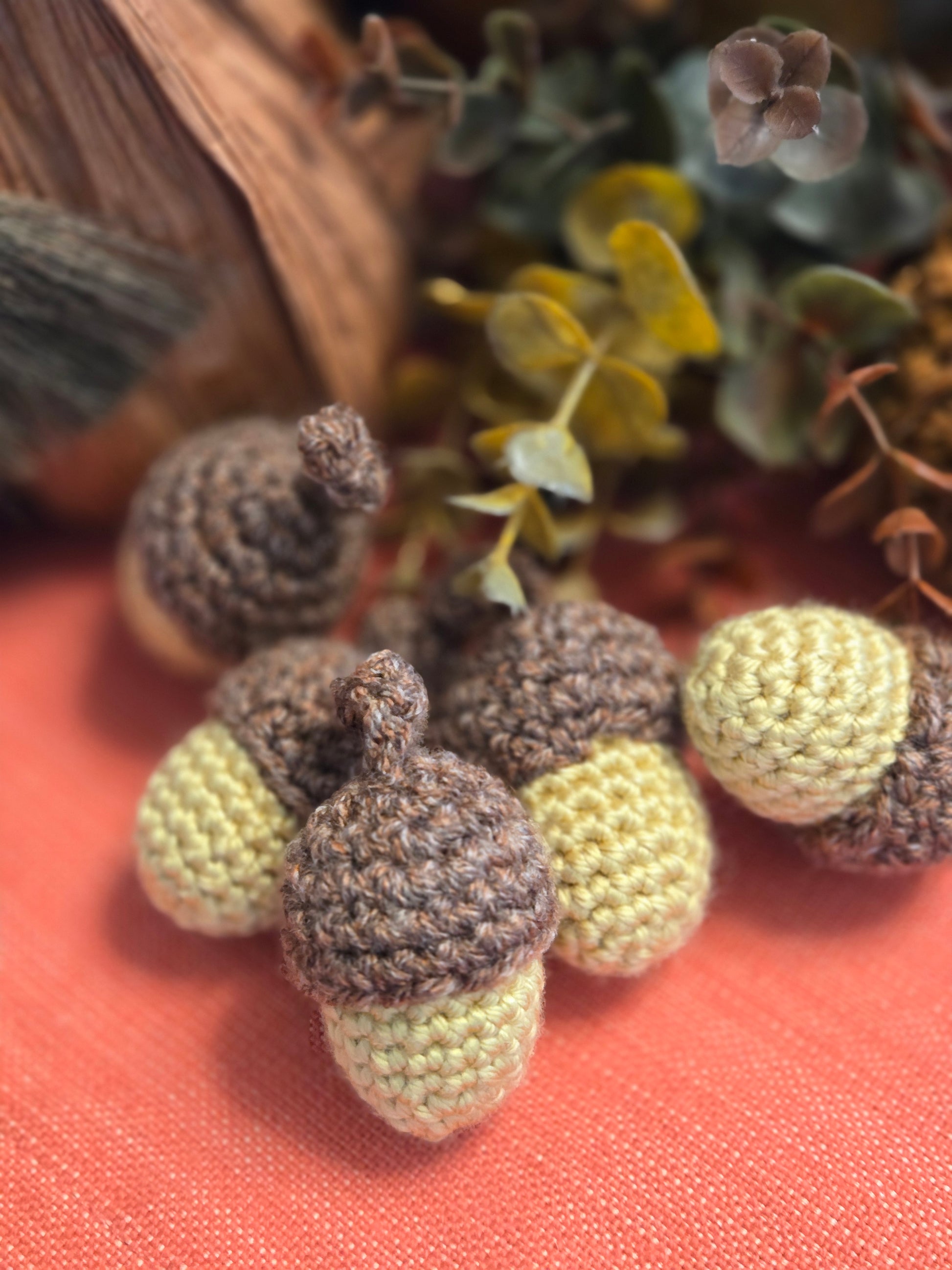 Description: Add a touch of rustic charm to your fall decor with these beautifully handcrafted crochet acorns. Perfect for accentuating your seasonal displays, these cozy acorns bring warmth to any setting. Whether sprinkled across your mantel, nestled in a decorative bowl, or woven into a wreath, their soft texture and natural colors evoke the essence of autumn. Made with care from high-quality yarn, these acorns are durable enough to be reused year after year.