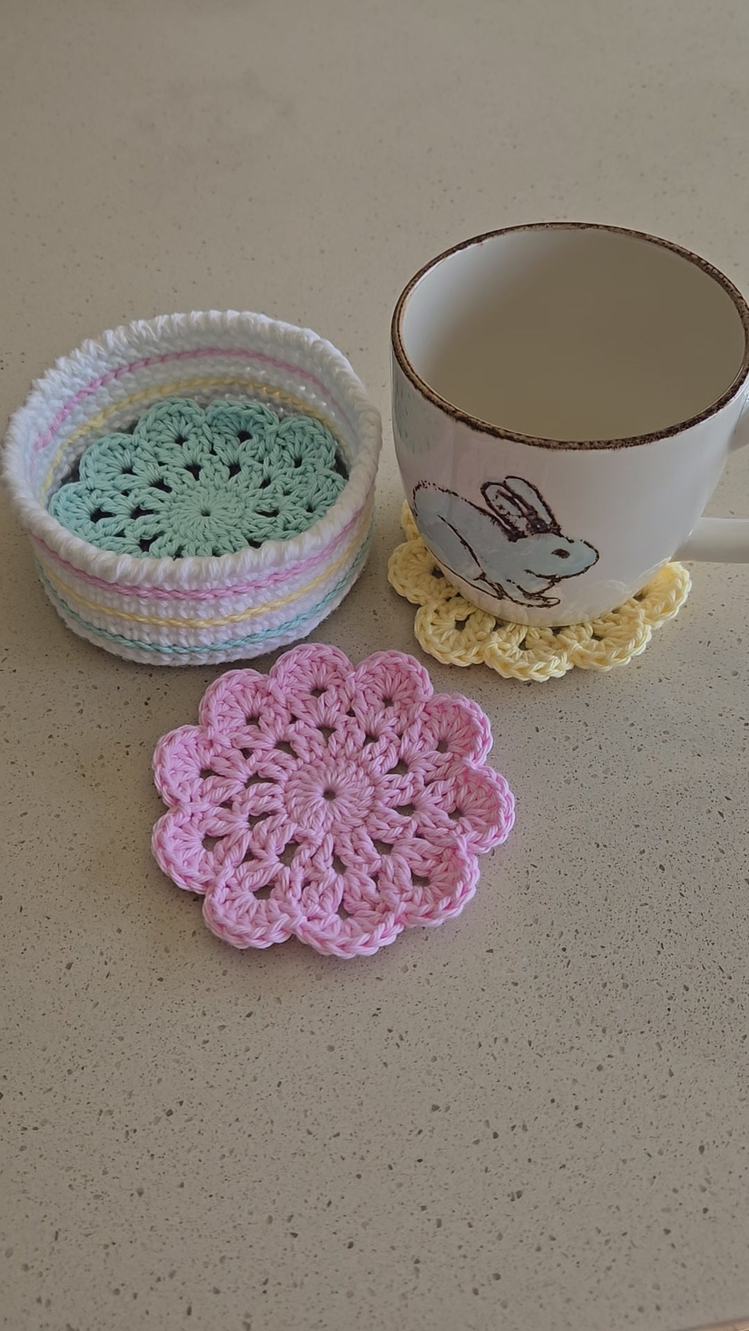 Welcome spring into your home with this charming handmade crochet coaster set! Perfect for Easter gatherings, these beautifully crafted drink coasters come in soft spring colors and neatly tuck into a coordinating basket holder for easy storage. Whether you're sipping morning coffee, hosting Easter brunch, or decorating for spring, these coasters add a cozy, festive touch to your space.