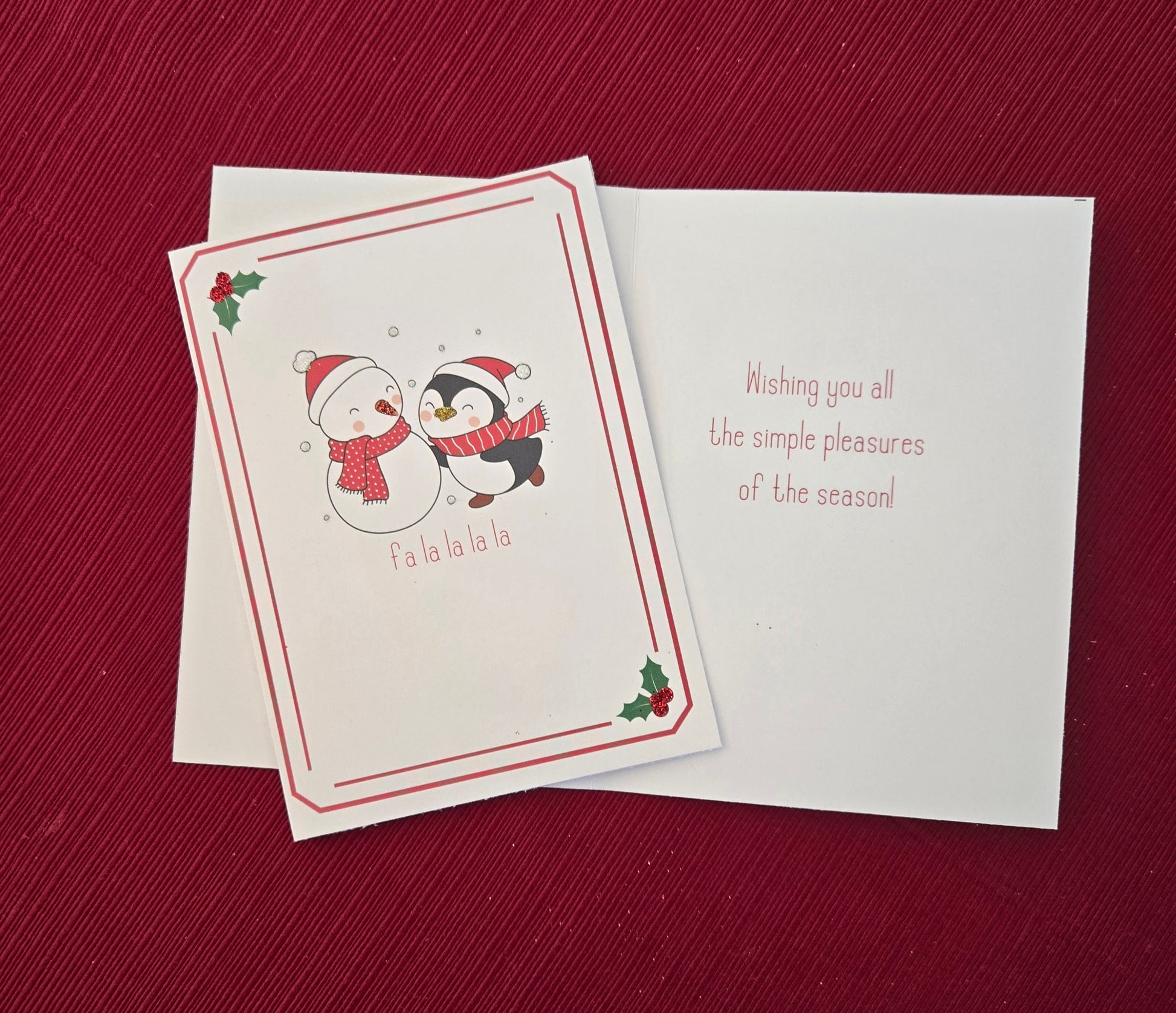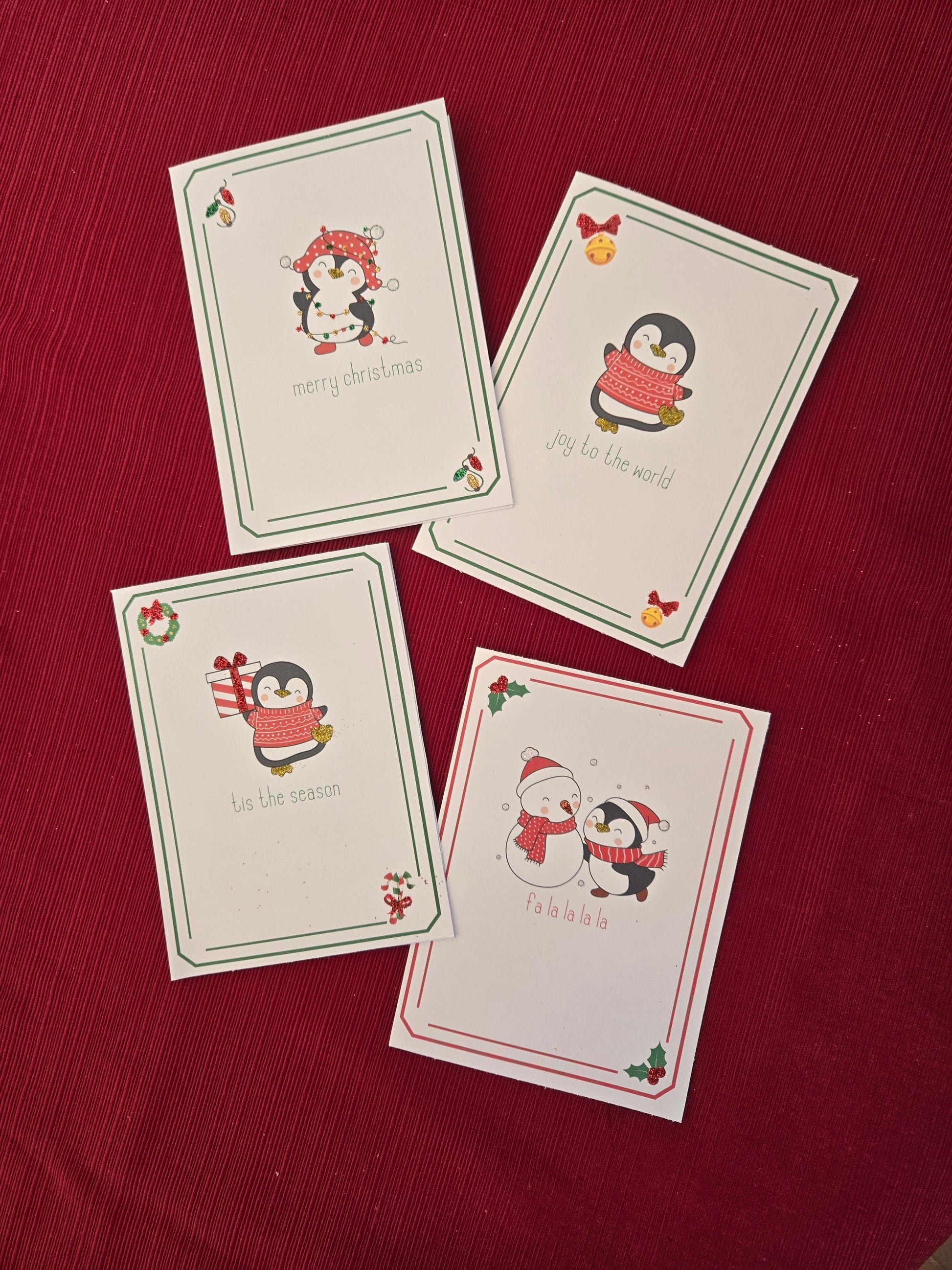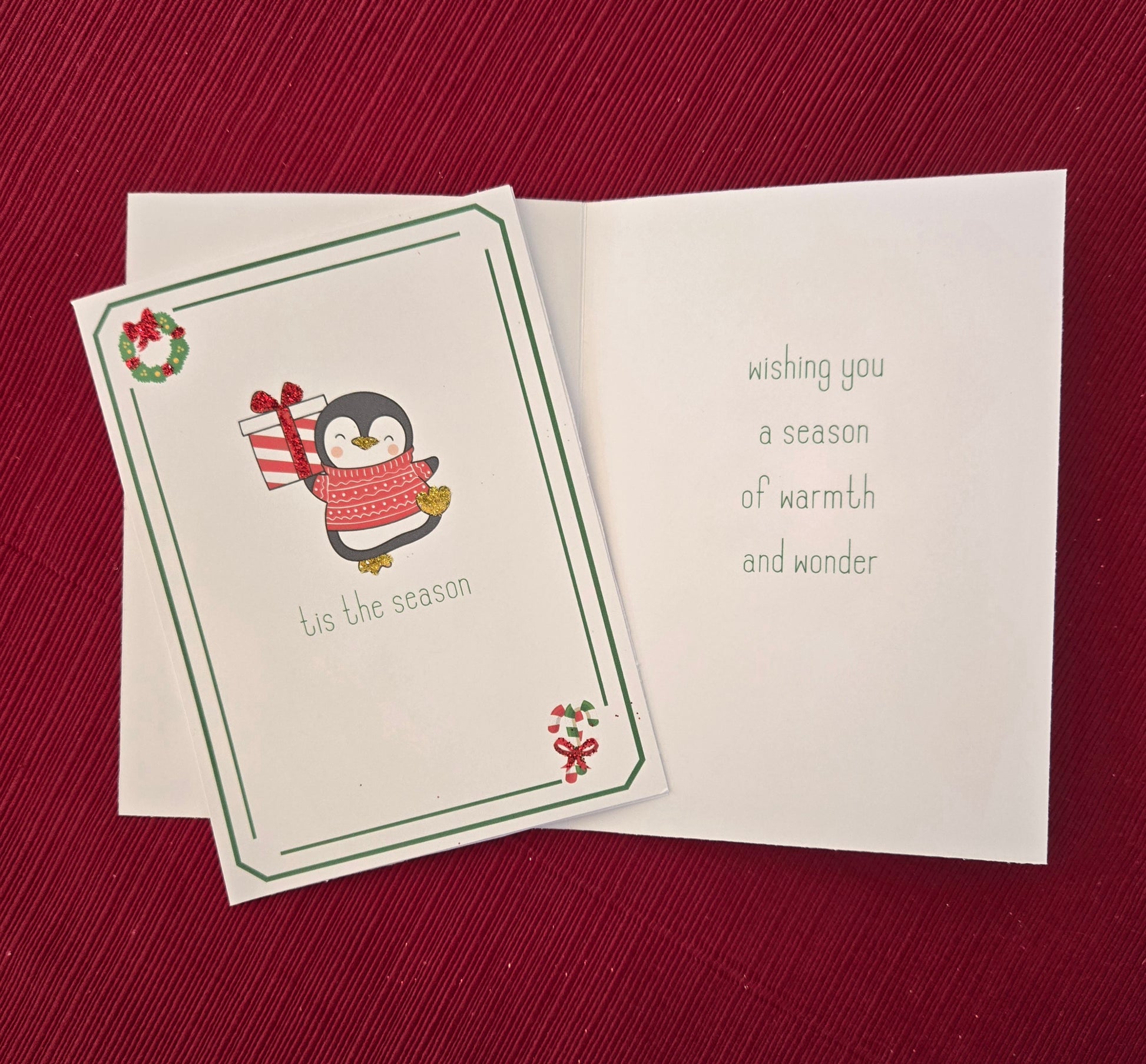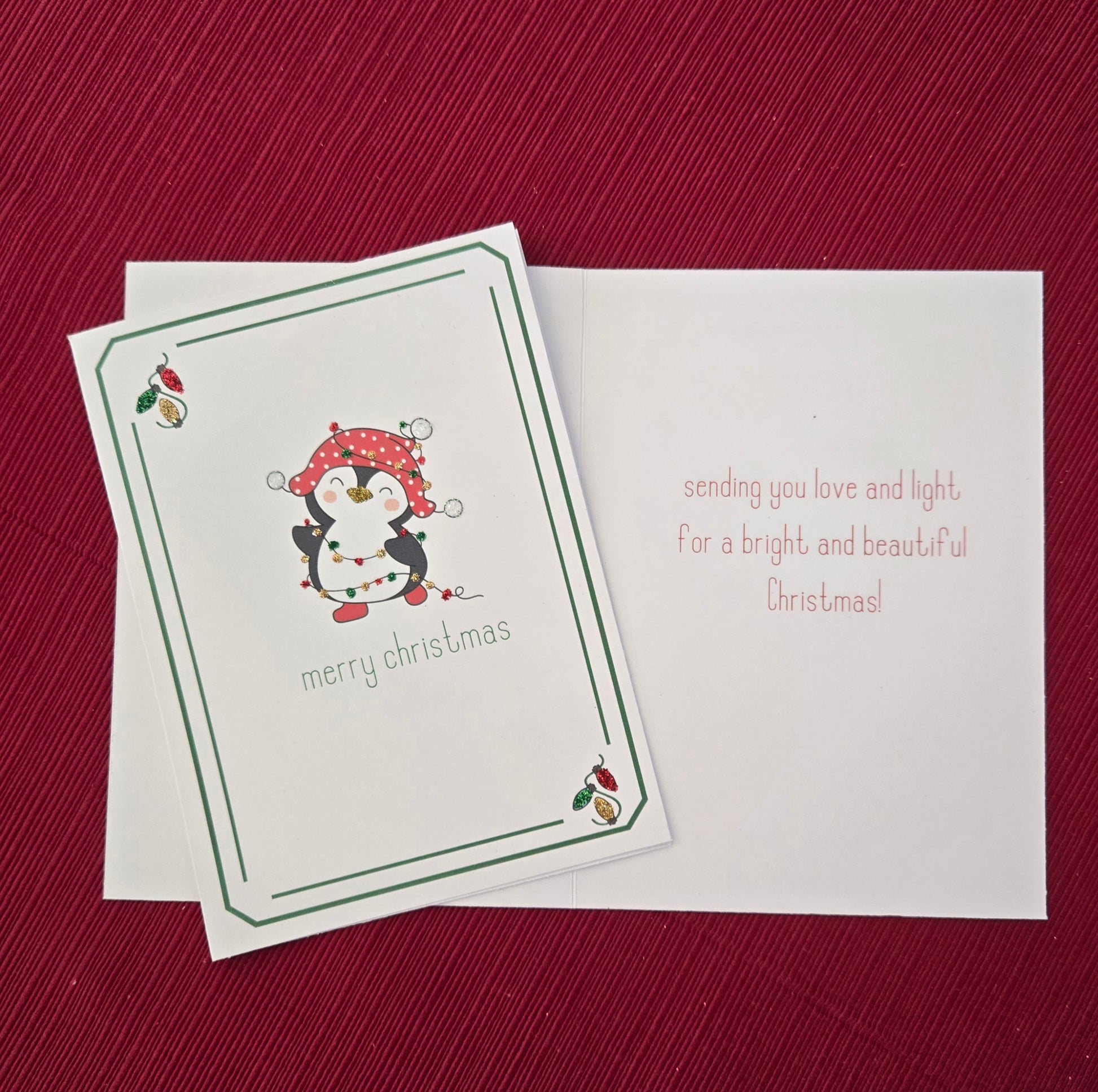 Delight loved ones this holiday season with our adorable set of eight penguin Christmas cards! (2 of each design) Each card showcases a charming penguin design, festively adorned with a touch of glitter for a bit of winter sparkle. Inside, you’ll find warm holiday sentiments crafted to bring cheer and joy to the season. Perfect for sending holiday wishes to family, friends, and anyone who loves the whimsical charm of penguins!