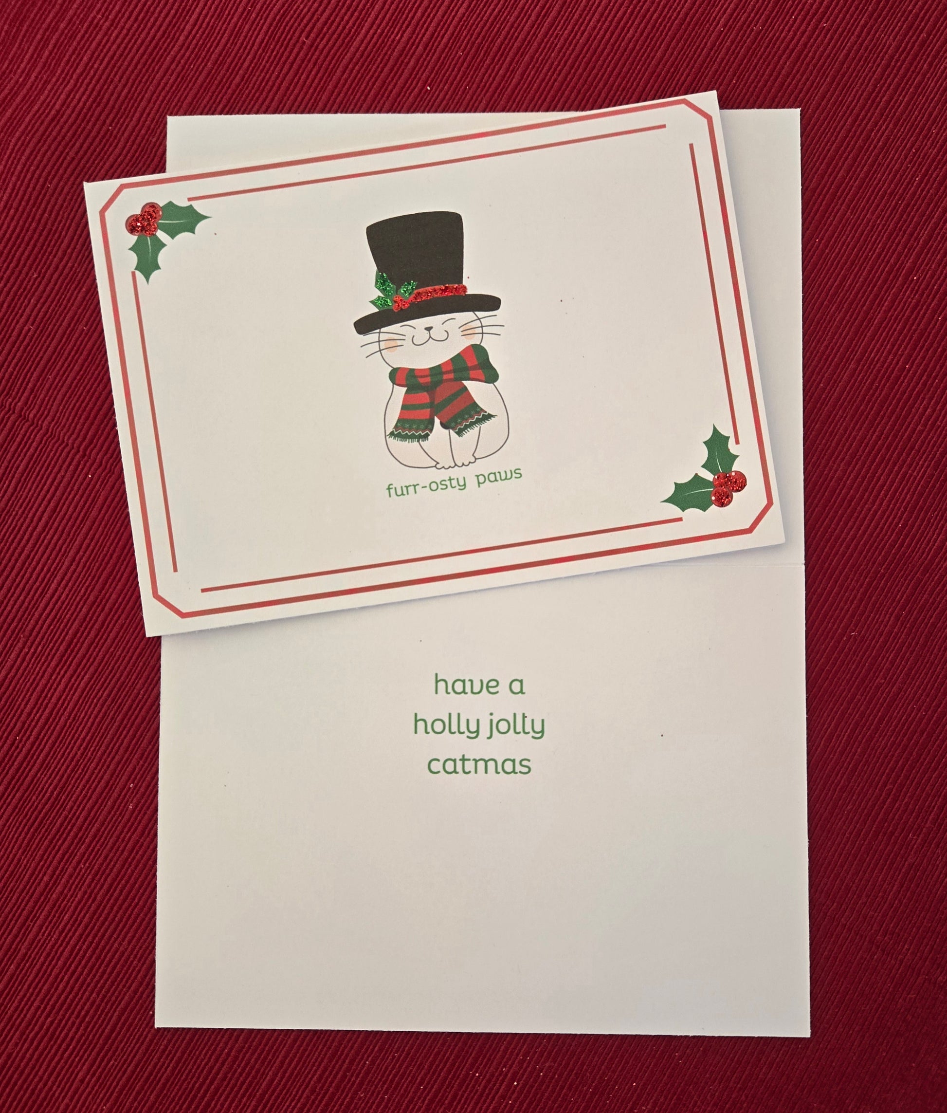 Spread holiday cheer with our set of eight, two of each design, glittered cute cat Christmas cards! Each card features a unique cat design and comes with a heartfelt sentiment inside. Perfect for sending to friends and family, these cards will bring a smile to anyone's face this holiday season.