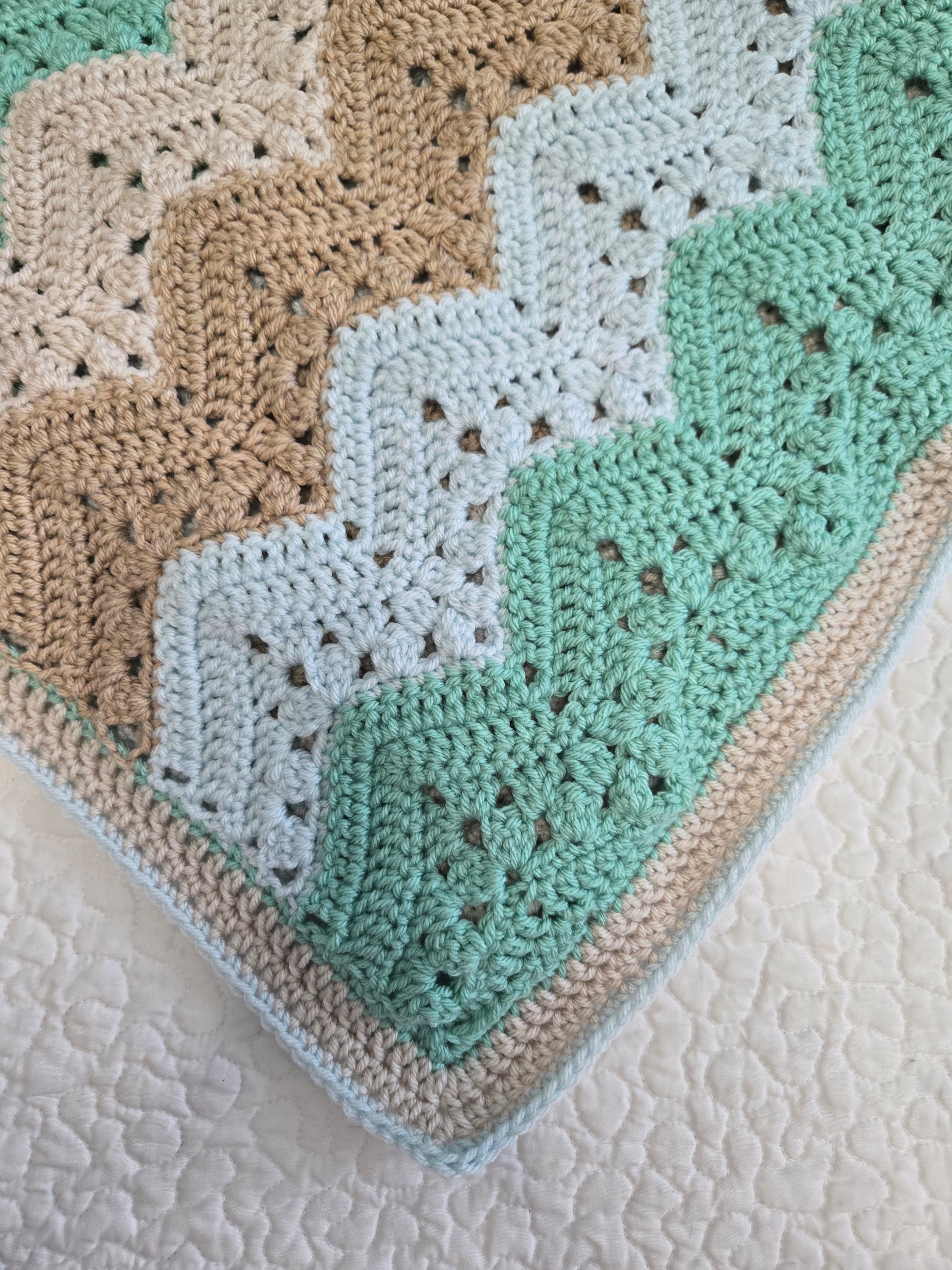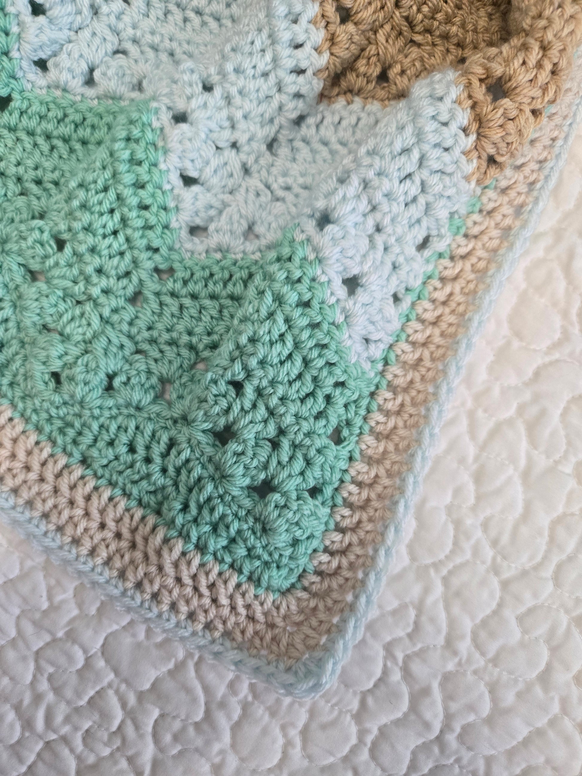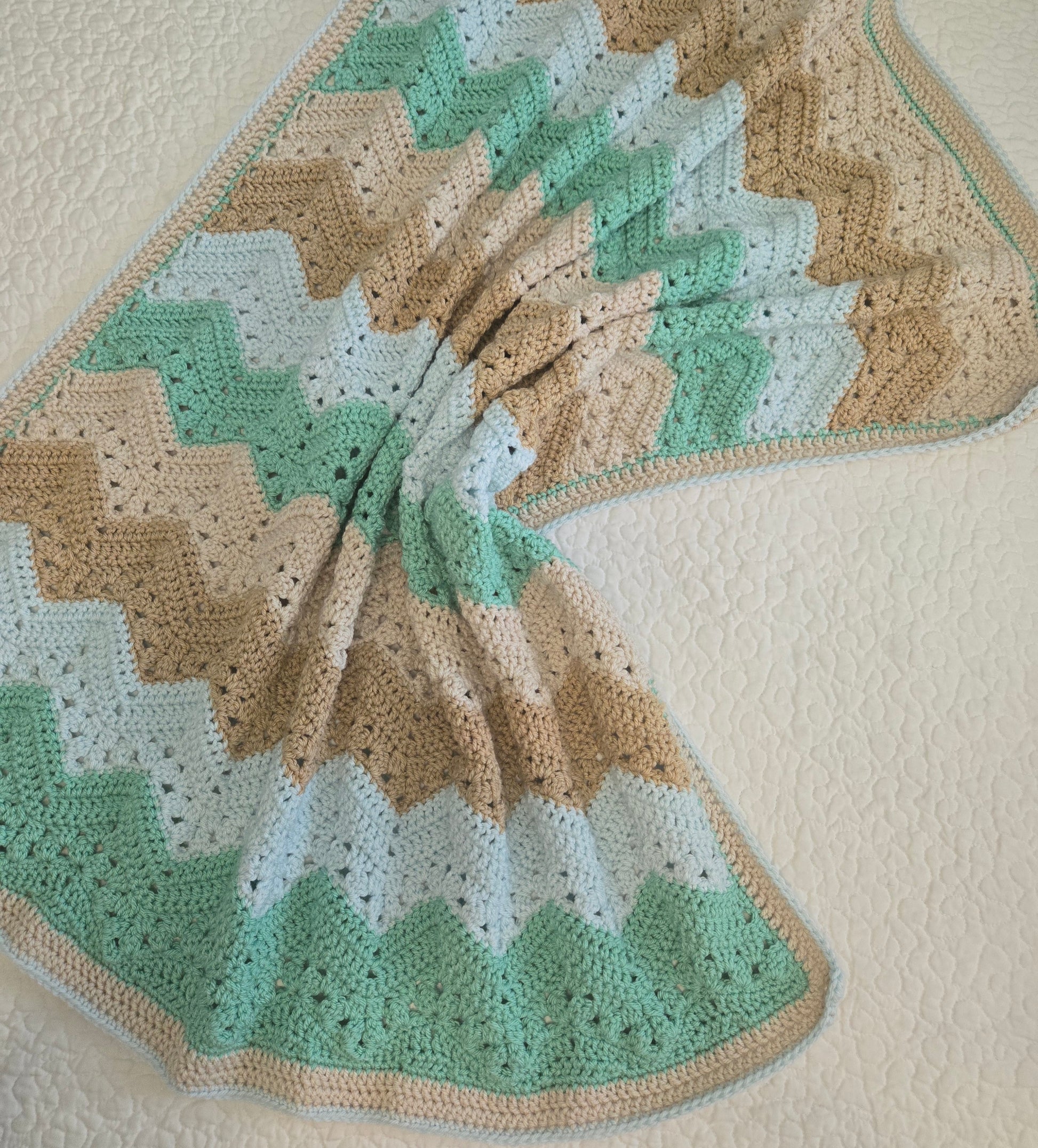 Wrap your little one in comfort with our handmade crochet baby blanket in soft green, blue, and tan stripes. Designed with care, this cozy and gentle blanket is perfect for nursery décor, newborns, and thoughtful baby shower gifts.