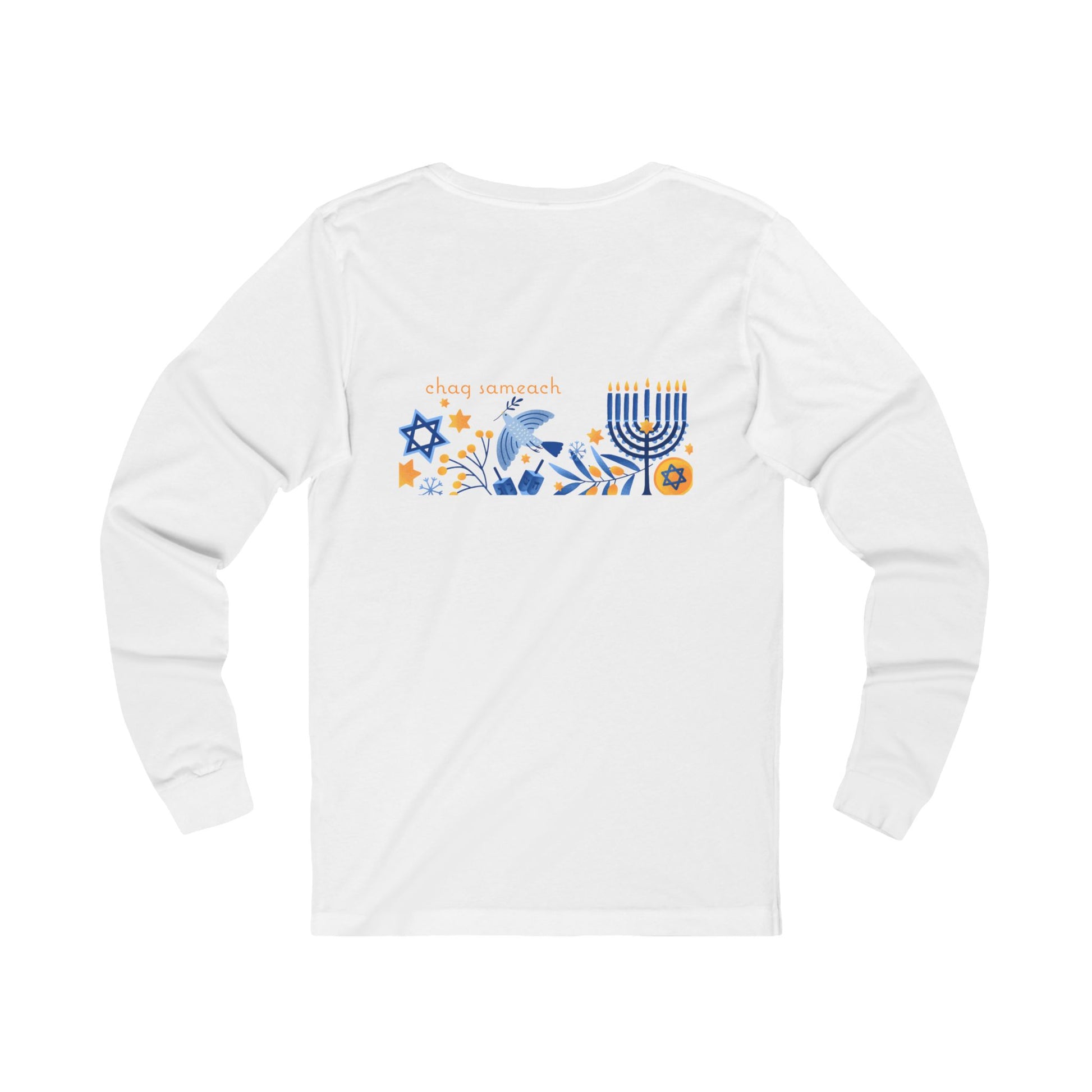 Celebrate the Festival of Lights in style with our Hanukkah long-sleeve T-shirt. Featuring a bold graphic design on the back and a smaller, subtle design on the front, this shirt combines comfort with festive flair. Crafted from a soft cotton, it’s perfect for keeping cozy during the holiday season while showcasing your Hanukkah spirit.