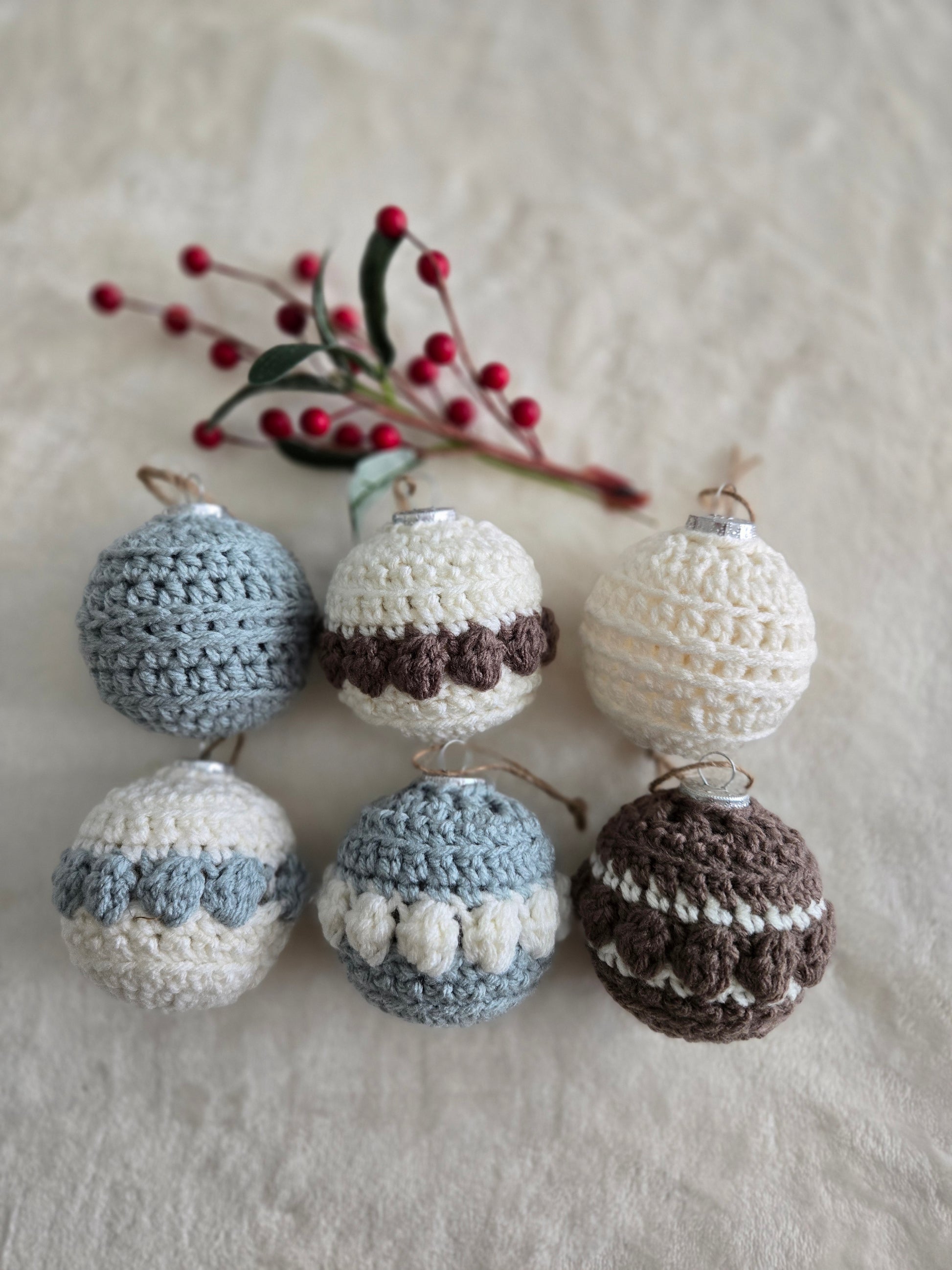 Woodland Calm Crochet Christmas Ornament Set – Set of 6 in Sage, Bark, and Cream
