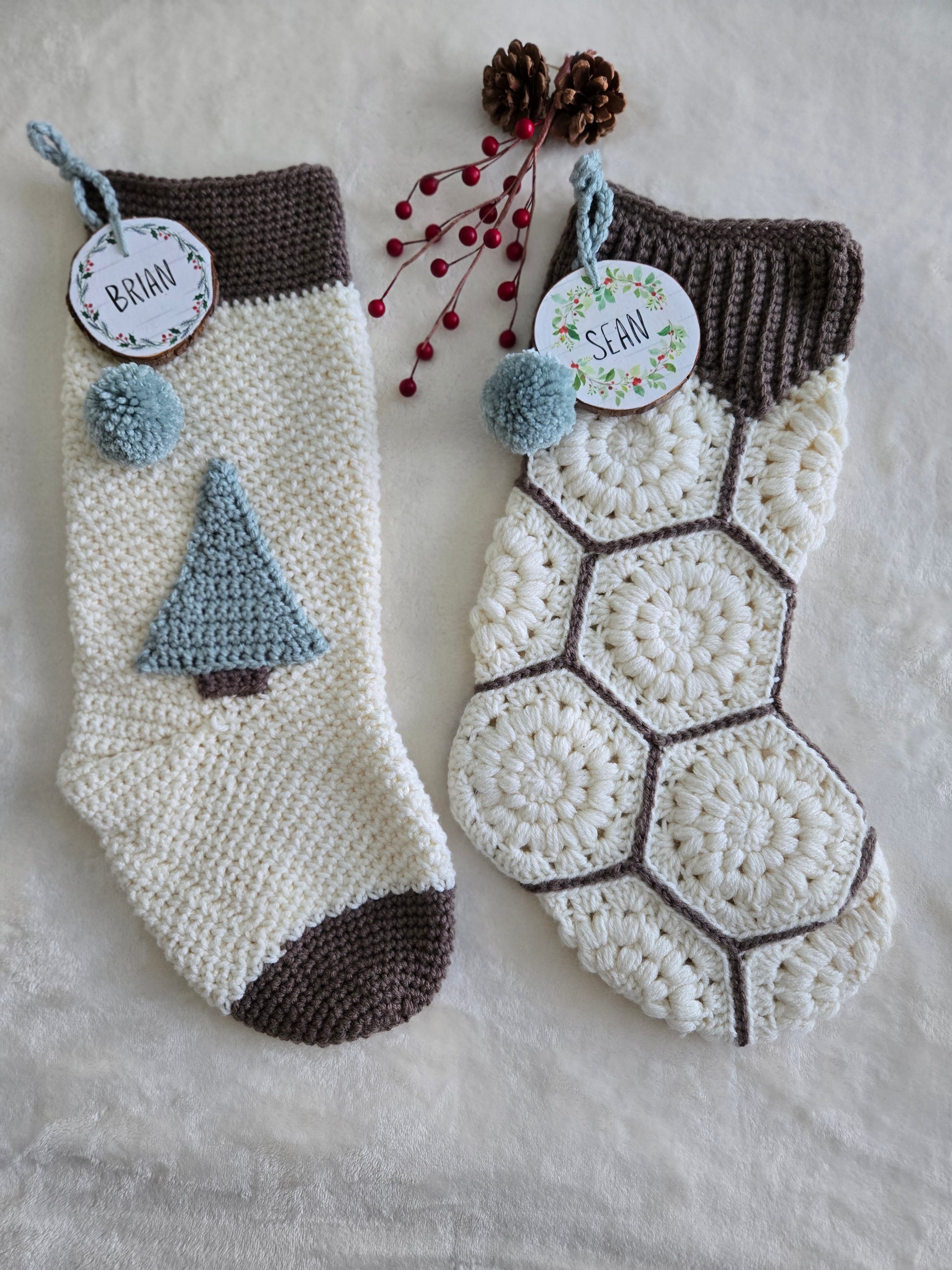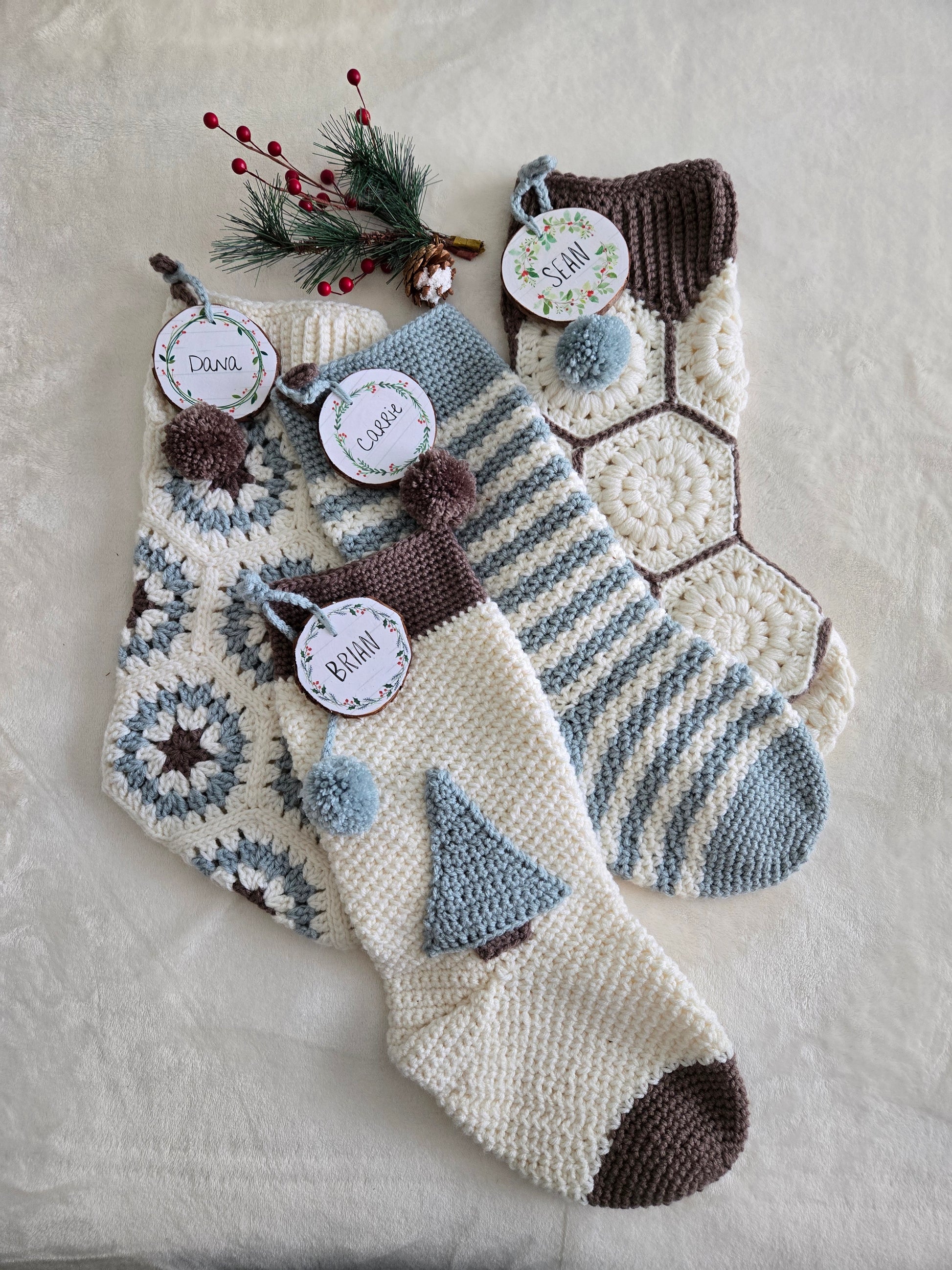Woodland Calm Crochet Christmas Stockings - Rustic Holiday Decor in Light Green, Cream & Bark